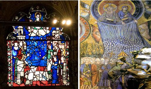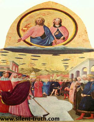 به وسیله ای که در دست پاپ برای اشاره به کندن زمین وجود دارد توجه کنید. همانطور که میبینید در همه ی این نقاشی ها منظور حضور ابرها و برف غیر عادی آن روز بوده است و در همگی شما آن کشیش و یا پاپ را مشاهده میکنید که در حال آغاز کردن کندن زمین برای احداث ساختمان کلیساست . اگر هنوز هم فکر میکنید آن موارد غیرعادی که یوفولوژیست ها بدان اشاره میکنند بشقاب پرنده هستند ، به تصویر بزرگنمایی شده ی زیر توجه کنید. برای مشاهده ی بهتر تصویر روی آن کلیک کنید . آیا متوجه دانه های برف میان ابرها میشوید؟ آیا حال باور دارید که این نقاشی نیز به هیچ بشقاب پرنده ای اشاره ندارد وتنها هدف این نقاشی به تصویر کشیدن داستان احداث کلیسای سانتا ماریا است؟ شاید بخواهید بگویید اگر آنها ابر هستند چرا اینگونه جدا از هم و بزرگ و کوچک به تصویر کشیده شده اند؟ برای سوال نیز پاسخی وجود دارد که این نوع تصویرنگاری از ابرها در سایر نقشی هایی که به ابرها اشاره میکند نیز دیده میشود. به نمونه های زیر توجه کنید . پس همانطور که میبیند طرح جدا از هم ابر ها چیز عجیب و غریبی نیست . نتیجه این است که گرچه تغییراتی آب و هوایی در امروز هم دیده میشود واین چیزی غیر عادی نیست ولی آن روز در میان مردم آن قسمت از ایتالیا به عنوان "معجزه برف" معروف شد و این نقاشی نیز تنها به آن داستان اشاره دارد و تحلیل یوفولوژیست ها مبنی بر حضور یوفو ها در این تاریخ تحلیلی دروغین وبرای فریب مخاطب است.