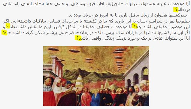 فراماسون ها در درجات بالا، مخفیانه "بعل" را تحت نامی مخفی و غیرعادی می پرستند تصویر شماره 7: تصویر زیر یکی دیگر از نمونه های پر استناد از حضور یوفوها در تاریخ است . این تصویر در موزه ای در ناپولی ایتالیا نگهداری میشود ومربوط به بنیاد کلیسای سانتا ماریای رم است. عقیده ی یوفولوژیست ها بر این است که در این نقاشی به وضوح حضور ده ها بشقاب پرنده را میبینیم واین نقاشی خبر از حقیقتی میدهد که نقاش به چشم خود آنها را دیده و واقعیت را نقاشی کرده است . این که حقیقت نقاشی شده ، درست است ولی باید دید آیا حقیقت همان چیزی است که یوفولوژیستها بدان معتقد هستند یا خیر! البته در سایت های یوفولوژیکی و مستند های اینچنینی بازهم از همان شیوه دانیکنیسم استفاده میشود ، یعنی چه ؟! به عنوان مثال به تصویر زیر توجه کنید . شما را با سوالات متعدد درگیر میکنند ودر آخر هدف و مقصود خود را به شما تحمیل میکنند ، چه نادرست ، چه درست شما به راحتی میپذیرید وذهنتان درگیر خواهد شد. اما حقیقت ماجرا چیست ؟! به اعتقاد اهالی رم و بر اساس افسانه ای قدیمی، در نیمه تابستان سال ۳۵۸ پس از میلاد مسیح (ع)، در محله ای از رم که امروز "سانتا ماریا ماجوره" نام دارد در ظهر یک روزماه آگوست داغ ، برف بارید و به همین علت به دستور مقامات مذهبی آن زمان، کلیسایی بزرگ در این محله با نام حضرت مریم مقدس بنا شد. به نظر شما چرا سایتها و کتاب های یوفولوژیست هچگاه تصویر نزدیکی از این نوع نقش ها را نشان نمیدند و یا تحلیل ها وداستهانها مربوط به آن را بیان نمیکنند؟! به نقاشی های دیگری که این داستان را نقل میکنند توجه کنید . این داستان در سایر نقاط ایتالیا نیز موردتوجه قرار گرفت ونقش هایی دیگر نیز که این داستان را نقل میکردند در سایر نقاط ایتالیا دیده شد یعنی اینکه داستان آن روز به صورت نقاشی در محل هایی دیگر از ایتالیا کشیده شد وحتی در برخی کلیساها به عنوان نماد نیز استفاده گردید .در زیر نمونه هایی دیگر را میبینید .